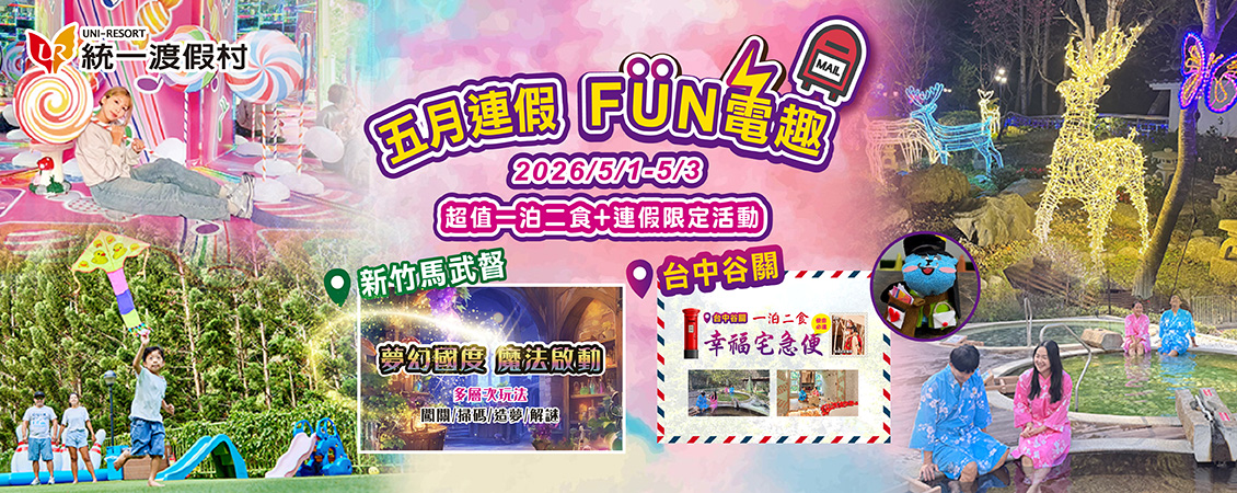 統一渡假村【五月連假】訂房攻略!入住飯店參加豐富精彩連假限定活動,食玩宿全包假期,盡情放電一整天。新竹馬武督展開夢幻國度魔法啟動,全新四象冒險,多層次的玩法不同冒險,考驗您的各項能力;親子共遊快樂放電,從早到晚飯店活動超滿檔,沉浸驚喜互動體驗,創造難忘回憶!暢玩園區設施及一連串活動,連假出遊最放電又有趣的行程!連假住宿立即訂→