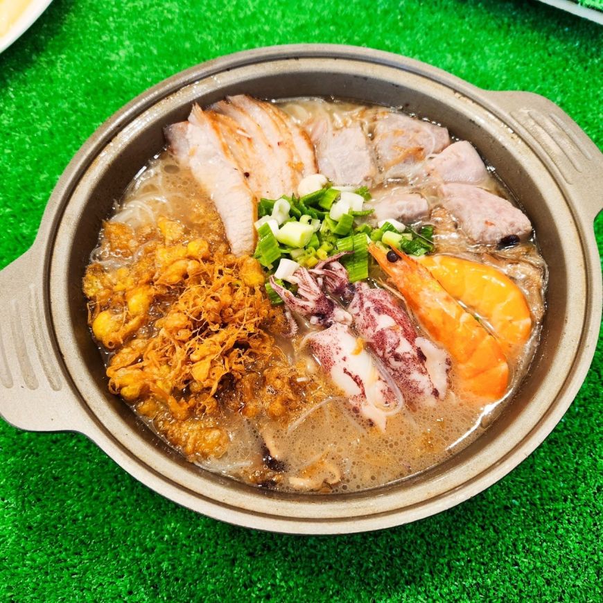 客家松阪米粉鍋 客家料理中常見的芋頭米粉為基底,加入以紅麴發酵的松阪豬,搭配新鮮小卷海陸一次享受,湯頭更將雞高湯與油蔥完美融合,形成多層次的香味。 |