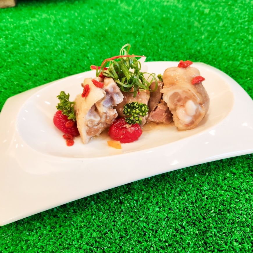 椒香味汁蹄 豬腳也能吃冷的!主廚使用花椒油與雞湯清蒸,保持口感Q彈同時降低油膩感,讓人吮指無窮。 |