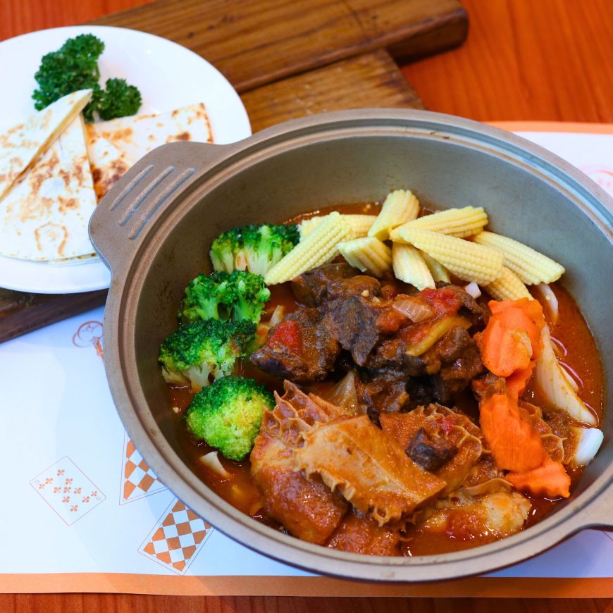 勃根地燉牛雙寶鍋 參考法國鄉村菜的作法,特別選用軟嫩帶筋的牛頰肉與牛肚燉煮,牛頰肉入口滑順又富嚼感,牛肚吸滿湯汁鹹香回甘,一鍋端上桌,香氣撲鼻。 再搭配香蒜起司脆餅一同享用,酥香口感與濃厚湯底溫暖又滿足。 |